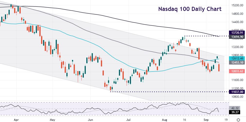 The Nasdaq 100 had been toying with the 50-day and 100-day SMAs, as we highlighted in Monday’s webinar. These act as initial resistance at 12,612 and 12,452 respectively. Bears will target this month’s low at 11,928. Below here, support is 11,488 and then the June low at 11,037.