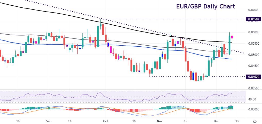 Bullish momentum has picked up sharply since EUR/GBP made new eight-month lows at 0.8380 just a few weeks ago. Prices consolidated around the previous October low at 0.84 before pushing higher back above the 50-day SMA.