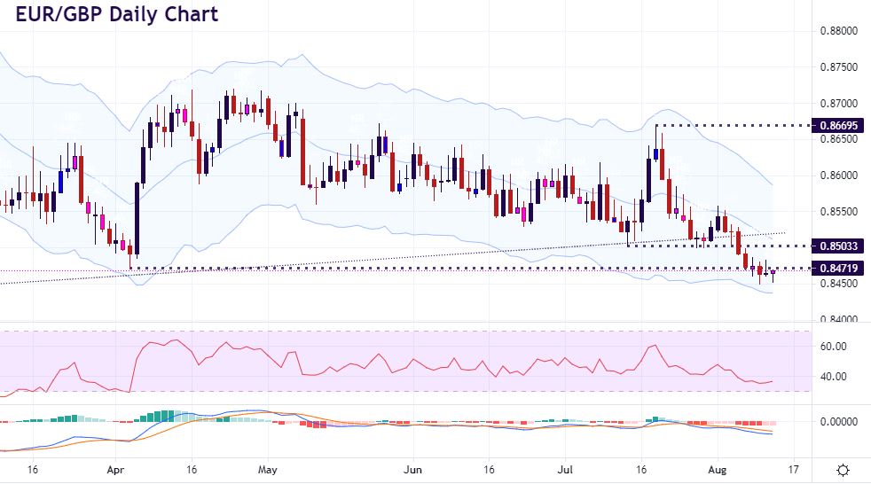We wrote a few weeks ago about how EUR/GBP failed at 0.8650 and a crack at the 0.8471 low was on the cards. The more hawkish commentary coming out of the BoE last week contrasts with the continued dovish guidance from the ECB. Today’s healthy 4.8% q/q bounce in Q2 GDP reflects the lifting of many restrictions, although the UK still lags other G7 countries.