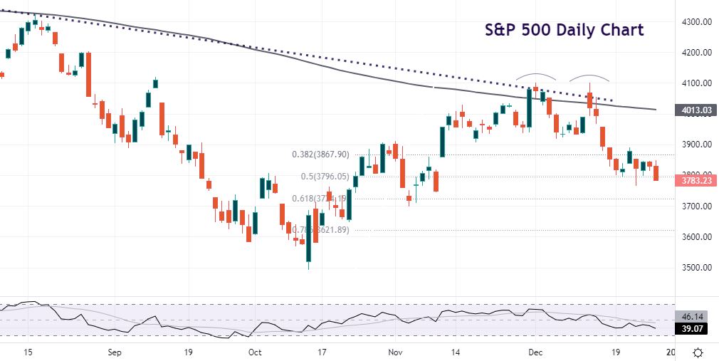 As much as we are aware of thin holiday volumes, markets can still trade on technical levels. The more than 1% fall in the benchmark S&P 500 index yesterday took out the 50% Fib level of the October rally at 3796. The area around this level has acted as support over the past week or so. But yesterday’s close below might now mean that sellers are in charge.