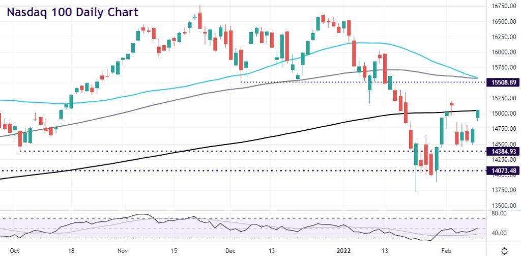 The Nasdaq 100 plunged to spike lows at 13,724 in late January but then consolidated above previous highs from April last year around 14,000. Dip buying has seen the index move higher again above next resistance/support at 14,384. Prices tried to move above the 200-day SMA at the start of the month but closed lower. This level at 15,048 is key for direction with upward momentum still evident but the daily RSI middling at 50. Bulls will aim for 15,508 while 14,384 is support.