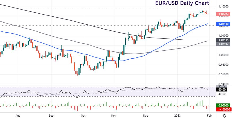 Stocks: US equities declined on cautious trade ahead of the Fed’s rate decision and a slew of big-tech earnings later this week. The benchmark S&P 500 fell 1.3%. The Dow finished 0.77% lower. The tech-heavy Nasdaq declined the most (-2.09%) in over a month. Meta report tomorrow after the US close. Apple, Amazon, and Alphabet release their Q4 results after Thursday’s closing bell.