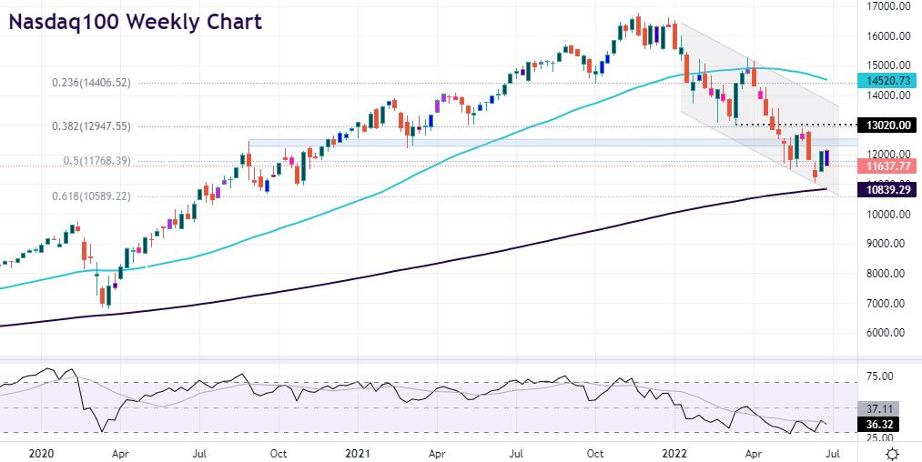 Prices have been in a bear channel in 2022 with a series of lower highs and lower lows. The middle of the month saw a new low posted at 11,037 on the Nasdaq 100. This was towards the bottom of the channel and the index bounced back above 12,000. But sellers stepped in and we are once again looking towards the lows.  The halfway point of the March 2020 low/record high sits at 11,768. The 200-week SMA is 10,839 with the next Fib level (61.8%) at 10,589.