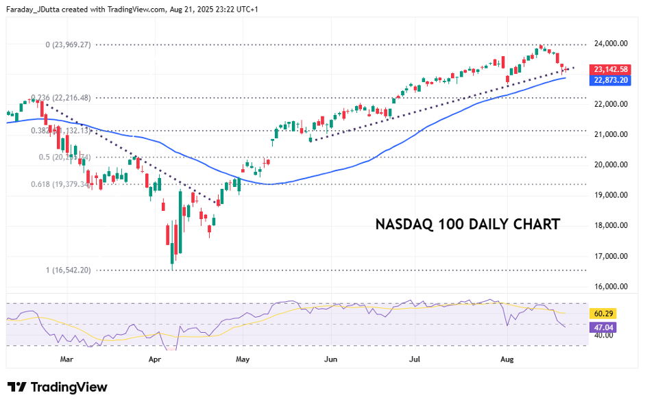 Recently, we had stories around MIT researchers believing companies were seeing little zero value from AI to Sam Altman warning that investors had got overexcited. But profit taking is probably the simple answer to this week’s sell-off as investors take profitable bets off after such a stellar rally in highly, overvalued names. The first Fib retracement level (23.6%) of the April rebound comes in at 22,216, which is the swing high from mid-February. The record high sits just below 24,000. Simply, a strident Powell could hurt stocks some more, a more dovish bias should reassert bullish momentum.