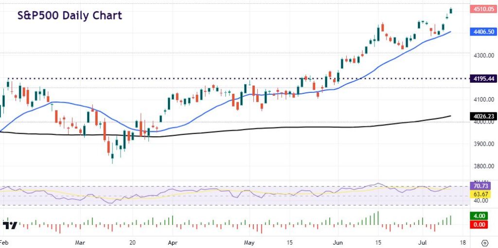 Stocks: US equities rose again on Thursday of the fourth straight day. The benchmark S&P 500 climbed 0.85% above 4,500. The tech-dominated Nasdaq outperformed surging 1.73%. Both these indices hit their highest levels this year. The Dow lagged and added 0.14%. Tech led the gains again with the NYFang up 2.7% and posting a record high close. Nvidia jumped to fresh all-time highs up 4.7%, while Alphabet rose by the same amount.