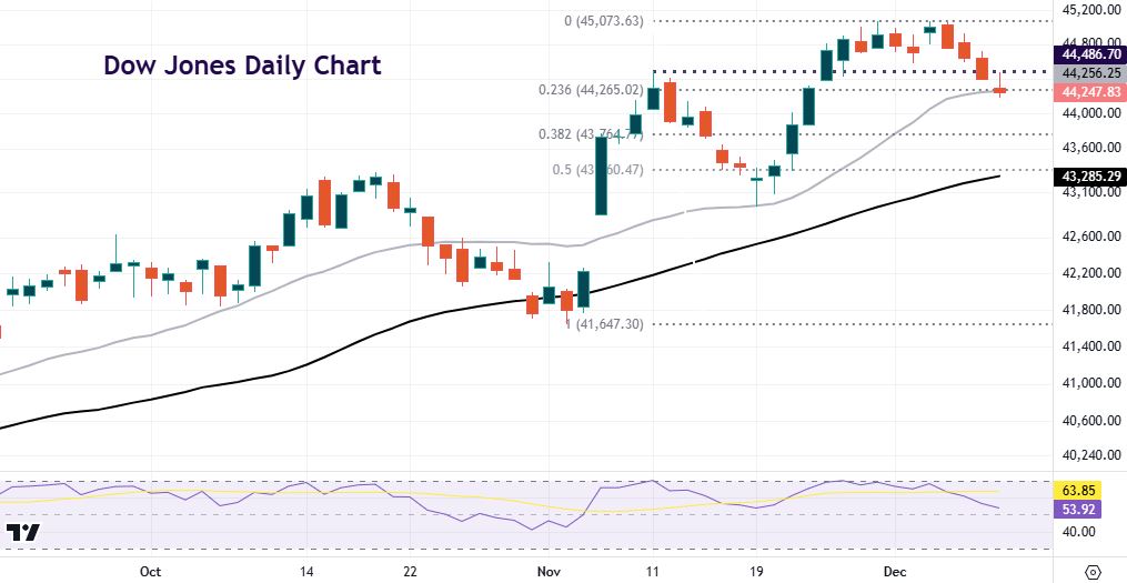 After breaking the previous record in November at 44,486, prices consolidated above here making marginal new highs. But four straight down days have seen the index fall through the November mark. Prices currently sit on the first Fib level of the November bull move and 21-day SMA around 44,260. Below is the major retracement (38.2%) at 43,764.