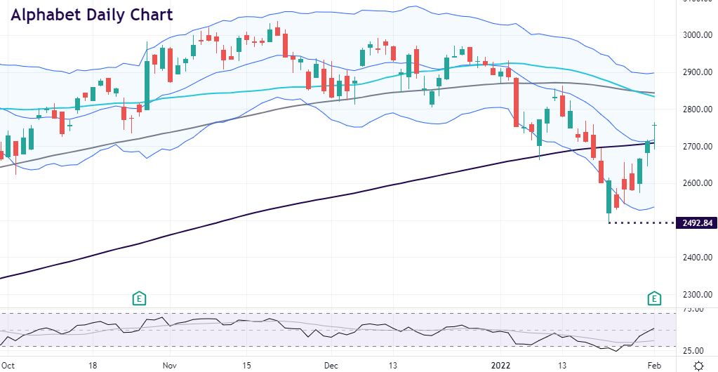 The stock hasn’t suffered as badly as other megacap tech stocks in the January selloff but dipped into oversold territory last Monday. Prices dropped through the lower Keltner band and below 30 on the daily RSI. The rebound has taken prices above the 200-day SMA at $2710 which now becomes support. Upside targets include the 50-day and 100-day SMA around $2837.