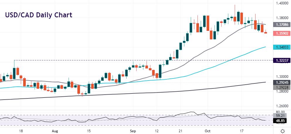 Last Friday saw a big bearish engulfing candle with a new high and lower close in USD/CAD. This suggests some downside risk in the short run. Support is 1.36 and then 1.35. Resistance is the 21-day SMA at 1.3708. Of course, much will depend on the BoC and if they guide lower.