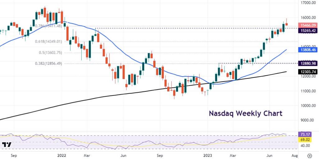 Big tech companies have underpinned much of this year’s rally on Wall Street. AI mania has driven stocks while hopes are high that global interest rates will not increase much further. The wider market ex-tech would be closer to flat on the year. Technically, we have been overbought for a period of time, so a pullback was to be expected. Resistance is this week’s top at 15,932 and then 16,000. Initial support is 15,411 and below around 15,000.
