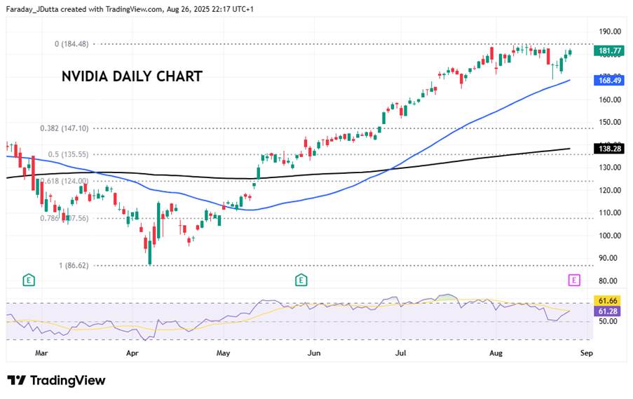 US stocks: The S&P 500 printed up 0.41% at 6,465. It was a small bullish outside day with a strong close. The Nasdaq settled up by 0.43% at 23,525. The Dow Jones finished higher at 45,418 adding 0.3%. Sectors were predominantly green with Industrials and Financials the top gainers, while Consumer Staples and Real Estate lagged with Energy and Communication Services. Apple said there would be a special event on September 9 where the iPhone 17 is expected to be announced. Boeing reported that Korean Air had agreed to buy 103 aircraft in a $36bn deal. All eyes are on the release of Nvidia’s quarterly earnings after the US closing bell. See below for more detail.