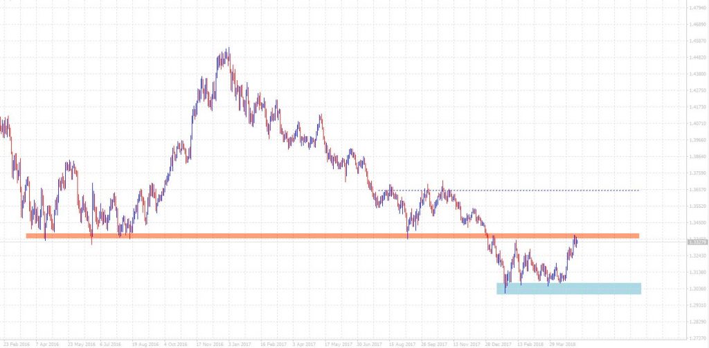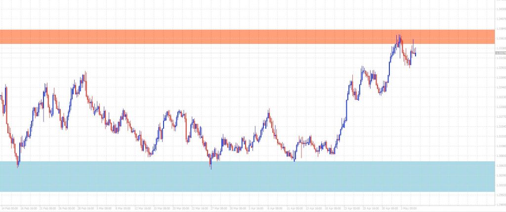 You can see in the recent candles that there has been some indecision at these recent highs, which could indicate that price isn’t yet ready to break upward. This could potentially be played as a range trade, where a trader could look for a convincing rejection of resistance aiming to target 1.32 area or even down to our coloured support zone.