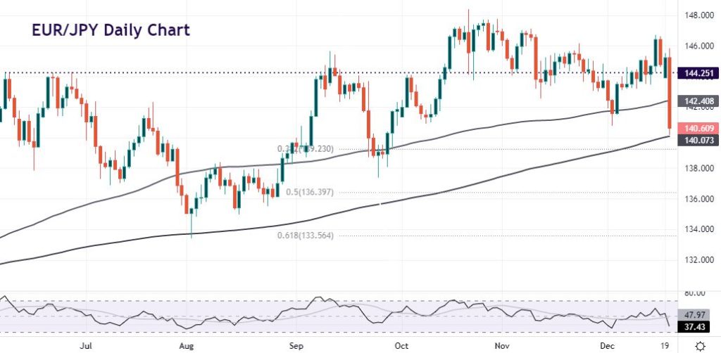 EUR/JPY has been trying to push decisively above previous highs from June and September over the last few months. But today’s plunge has taken it sharply lower through the 100-day SMA at 142.40. The 200-day SMA is at 140.07. below here is a major Fib level of the year’s rally at 139.28.