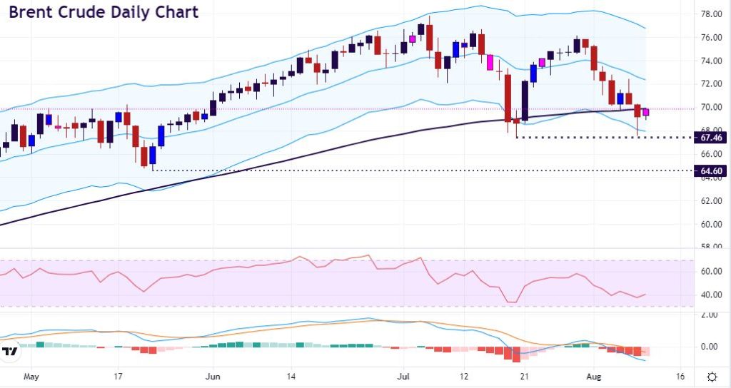 Brent broke down through the 100-day SMA yesterday and neared the July support zone around $68. But prices touched the lower Keltner channel and have retraced back to the moving average today. China is of course a demand risk, but strong government action may mean these risks are short term and this is a buying opportunity.