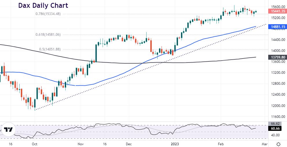 The German Dax stock market is vying with the Nasdaq for positive performance this year. Both indices have gained around 10% in 2023. The Dax is up more than 30% since its lows in October. Peak pessimism in the eurozone saw German’s top 30 companies hit a low of 11,809.