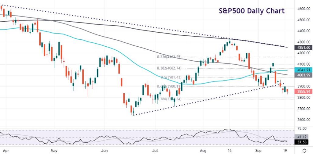 The S&P500 found support at 3,900 and the 61.8% Fib level of the June to August move. But the shock red hot US CPI data did for that rally. Prices moved sharply below the 50 and 100-day SMAs around 4,000. Short-term trendline support has also been pierced. This acts as resistance just above the 3,900 area. Support below is a minor Fib level at 3,783 and then 3,721.