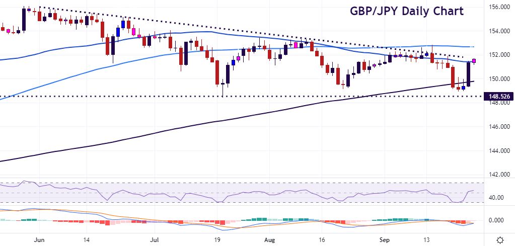 Prices are now back above the 50-day SMA and closing in on trendline resistance from the late May highs. This has capped upside for the pair on several occasions. If the bullish momentum continues, the September high at 152.85 sits above, near to the 100-day SMA. We note the MACD has not yet turned bullish.
